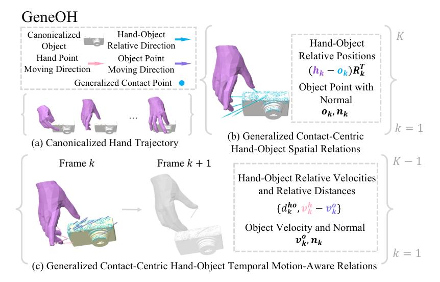 具体来讲,GeneOH Diffusion 设计了一套以广义接触点为中心的、包含手物时空交互信息的序列表征,名为 GeneOH。GeneOH 包括 位姿标准化后的手物轨迹、以广义接触点为中心的手物空间关系表征、以及以广义接触点为中心的手物时间关系表征。(图 3)