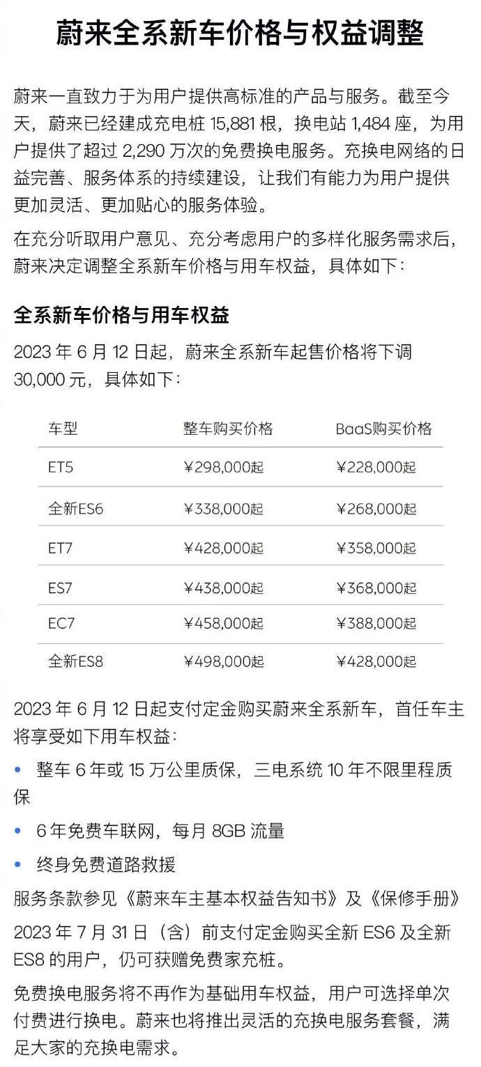 还有一类更为隐蔽,围绕车主权益变动做文章。车主权益涵盖服务、赠品、金融保险等。如去年6月,蔚来从月销量过万下跌至6000多辆之时,宣布全系列车型降价3万,但以「降价换权益」的方式落地,车主基础用车权益里去掉了终身免费换电(每月四次)等核心服务。
