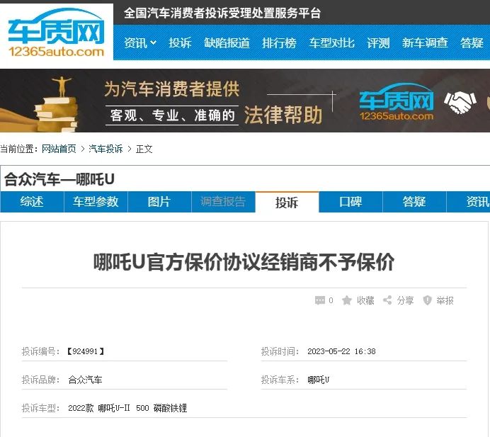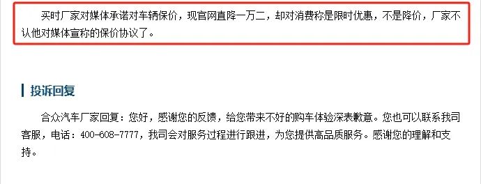 但《降噪NoNoise》查阅中国汽车质量网发现,去年5月,就有用户投诉哪吒厂家,投诉内容为:「买时厂家对媒体承诺对车辆保价,现官网直降车一万二,却对消费者称是限时优惠,不是降价,厂家不认他对媒体宣称的保价协议了。」