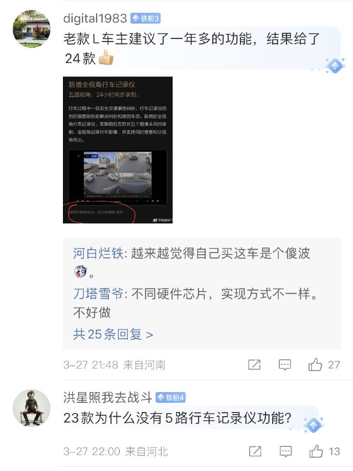 在受访前一天,理想刚刚更新了行车记录仪功能,并在公告中称,该功能只有24款L系列和Mega可以使用。「老车主在内测群里喊了一年的功能,最后却享受不到升级更新,只能新车主去用」,对于李好这样的次新车主来说,这无疑会催发一种被剥夺感。