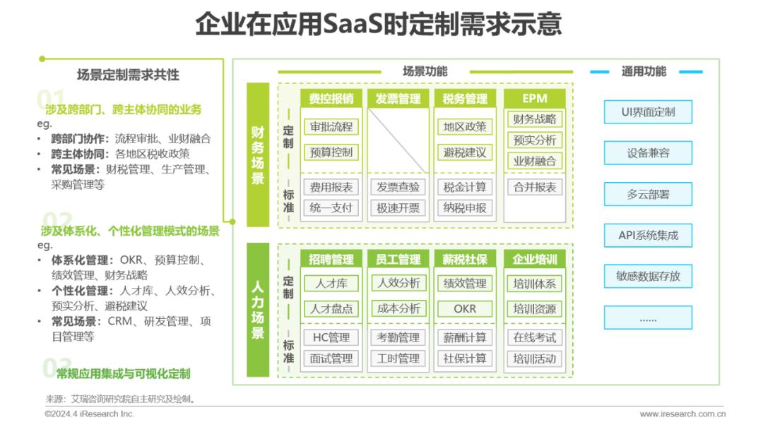 SaaS多以标准化产品形态对外交付,但在实际应用中,企业规模越大、发展时间越长,在功能上就需要更多的兼容性:包容不同部门的业务习惯、不同管理方法论等,因此有更多定制需求。可以将企业的定制需求分为两类:1)场景功能定制需求:在特定功能上由于企业业务操作特殊性产生的定制化需求,通常可以通过PaaS模块下放定制化权限、提取定制化需求公约数、推出不同版本等规避;2)通用功能定制需求:多为SaaS模块化产生的系统集成、多云部署等需求,可通过提升操作易用性简化交付难度,但无法规避。