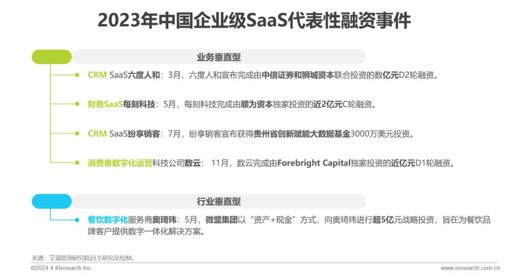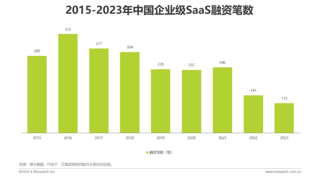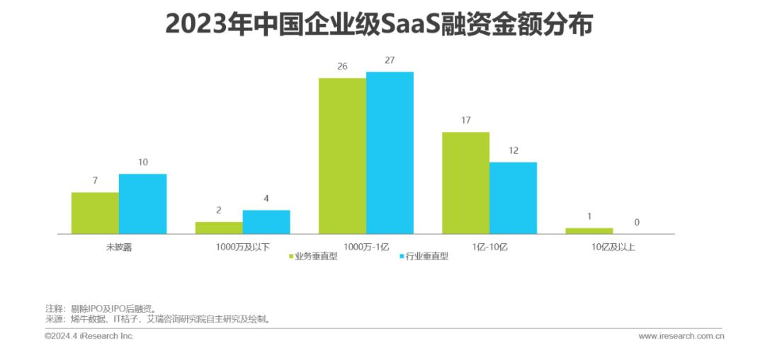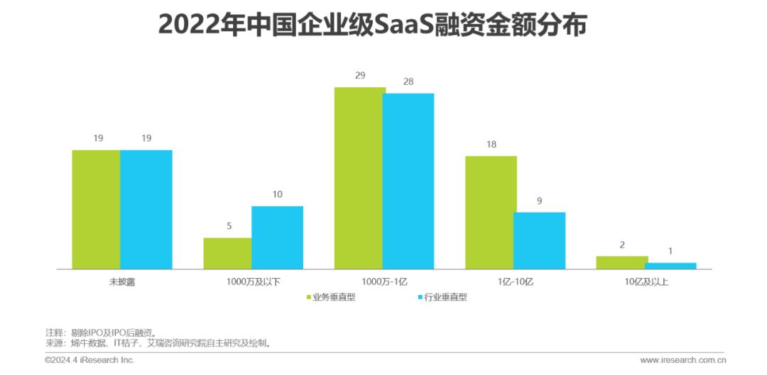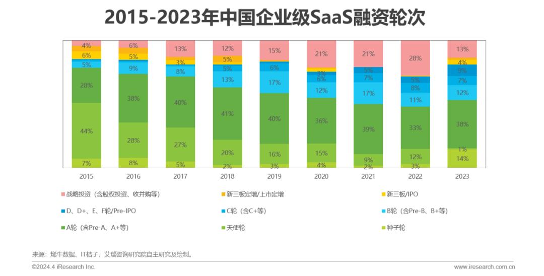 尽管近几年SaaS领域业务与行业垂直型厂商的融资笔数大体相当,但2023年行业垂直型的占比首次反超。而从融资轮次上看,行业垂直型赛道的融资更偏早期,未来SaaS赛道的成长机会将更多来自于行业垂直相关领域。