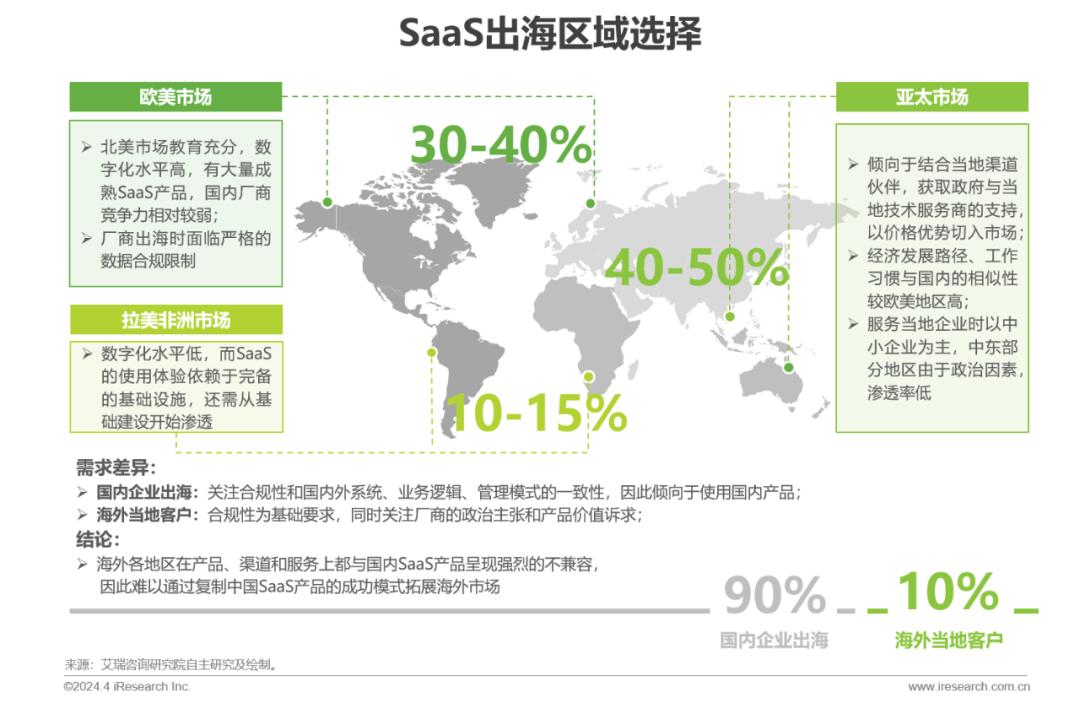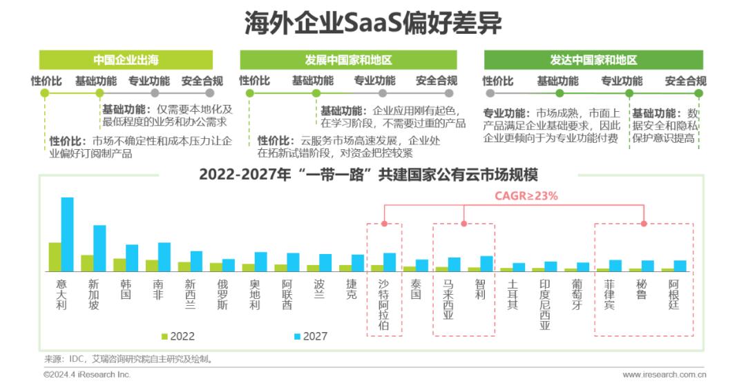 根据海外企业类型、用云成熟度和SaaS偏好,大致可分为三类:1)中国企业出海:出海企业往往面临着较高的市场进入门槛和风险,因此更倾向于订阅制SaaS产品。且就本地化难度而言,管理类SaaS有更低的本地化壁垒,更契合出海企业管理思路;拓客层面对SaaS厂商本地化考验较大,目前主要在跨境行业有相对专业的SaaS产品可选。2)发展中国家和地区:如“一带一路”共建国中的马来西亚、菲律宾、阿根廷等,尚在用户习惯培育和成本敏感阶段,云市场接受度高、增速快的地区更有SaaS发展空间。3)发达国家和地区:已具备相对成熟的SaaS基因,市面上可选SaaS产品充分竞争,愿为特殊行业或特殊领域具有高度专业性的SaaS产品付费。