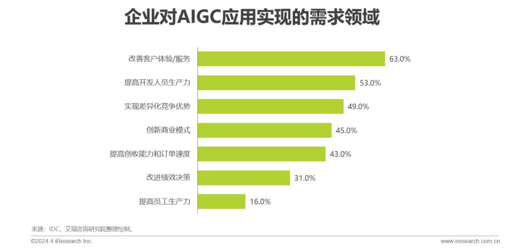 企业对AIGC实现的需求集中在优化客户体验、提高响应及时性、增强开发人员能力、构筑企业差异化竞争优势等方面,基于业务流程,结合环节链条,深入到设计、开发、制造、营销、财务等环节。