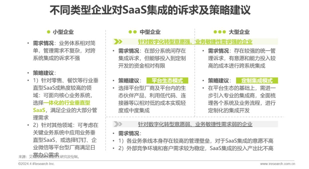 SaaS应用在企业中的渗透率不断提升,越来越多的企业开始面临多家SaaS产品组合应用的局面。为提升使用体验,对业务进行统一管理,部分企业产生了SaaS集成的诉求。整体来看,小型企业的业务简单,集成诉求弱,而中型和大型企业当中数字化转型意愿强、业务敏捷性需求强的一类,对跨系统集成表现出了较强的倾向。由于大型企业的系统复杂程度高,定制化开发不可避免,适合由专业集成商主导进行全局统筹;而对于中型企业而言,选择平台型厂商更符合企业的发展阶段,可以基于平台提供的低代码、连接器等实现相对标准化的系统集成。