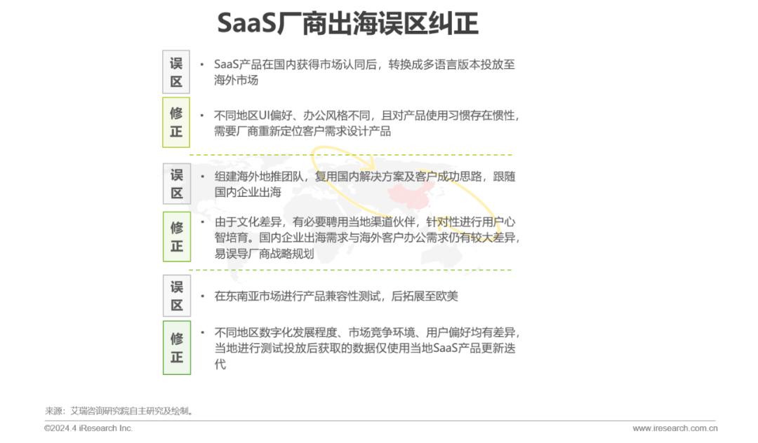 当前中国SaaS厂商出海规模尚小,且主要围绕跨境电商及其产业链向海外发展。少数协同办公平台与工业SaaS也尝试通过服务国内企业出海的形式向东南亚等地延伸,但受限于产品认可度、品牌传播力度、安全合规约束、用户使用体验等多方面因素,SaaS厂商在海外的表现并不惹眼。综合来看,国内SaaS厂商出海普遍存在认知误区,复用国内SaaS成功经验和商业模式的思路在海外行不通。