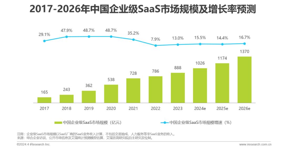 市场趋势:大浪淘沙,SaaS行业进入关键转折点,企业级SaaS的总体市场规模达到888亿元,同比增长13.0%。内外部因素叠加之下,预计三年未来企业级SaaS市场规模的增速将稳定在15%-20%的区间,未来三年复合增速约15%。