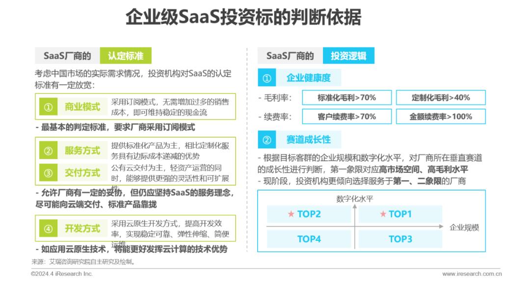 过去几年,部分SaaS厂商为追求收入增长而向定制化、本地部署妥协。在这个过程中,投资人的激进同样损害了SaaS行业的健康发展。随着诸多细分赛道的增长放缓,现阶段无论是投资人还是SaaS厂商,都更应该强调SaaS的价值回归。从SaaS的认定标准上看,目前投资机构对订阅模式的优先级大于标准化产品和公有云交付。需要意识到,标准的放宽只是短期妥协,背离SaaS标准意味着放弃SaaS模式的高成长性与盈利能力,将难以支撑SaaS高于传统软件的估值。同时相比以往,投资机构对SaaS厂商健康度的关注度有所提升,对于毛利率和续费率的要求更加严格。服务客户体量大、数字化程度高的SaaS厂商成长确定性高,也会更受投资机构青睐。