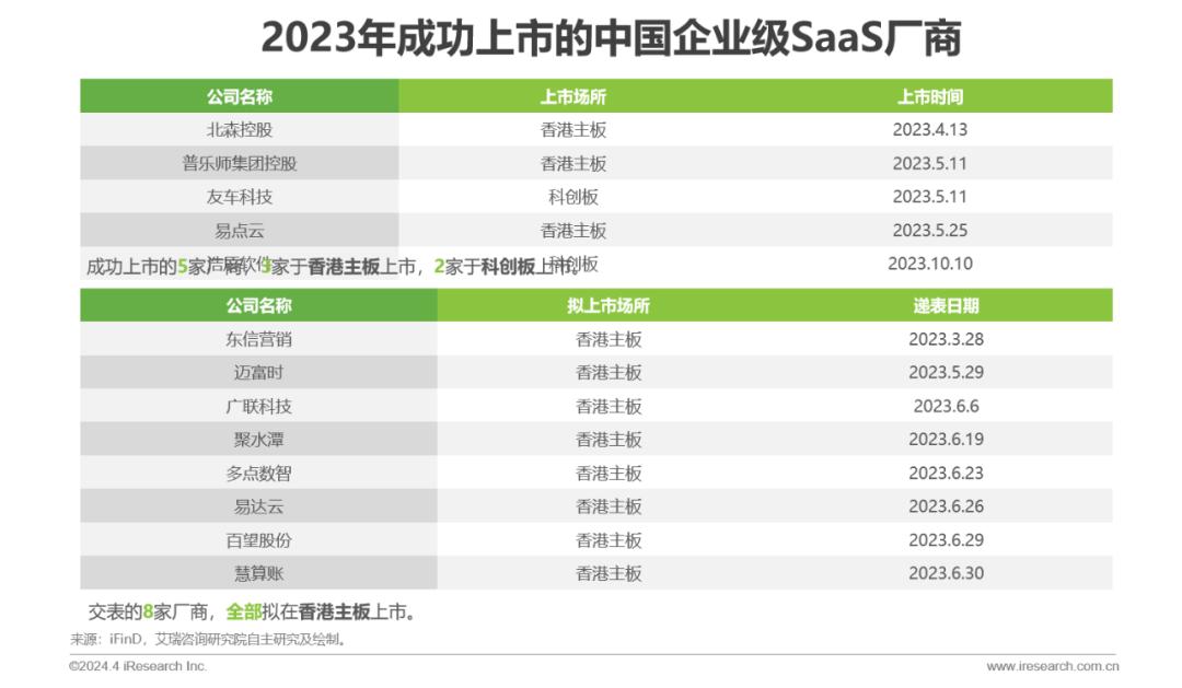 从财务数据上看,内地和香港的已上市SaaS厂商营收增长率均表现出一定程度的下跌,但毛利率指标仍然维持在健康的水平。相较而言,内地上市公司的平均营收增长率低于香港上市公司,而平均毛利率则高于香港上市公司。这主要是因为内地对上市企业的盈利能力要求严格,香港的上市规则对高成长性的企业更加友好。整体呈现出港股成长性好、A股盈利能力佳的局面。2023年交表的8家SaaS厂商均选择香港主板作为拟上市地,随着未来内地上市环境的优化,SaaS厂商也可以考虑选择科创板或北交所上市。
