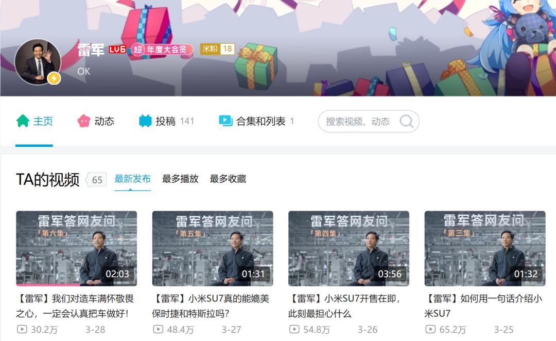 受此影响,当前大部分企业家的所谓“个人账号”更像是所在企业的营销口。以最近爆火的雷军为例,其在2020年入驻B站,虽然有一些配合网友的鬼畜内容,但主要内容还是配合小米的产品宣发。在小米SU7相关视频发布前,其B站账号已断更半年。