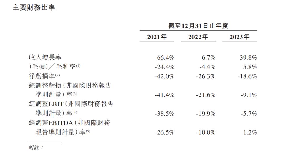 2021年-2023年,公司收入分别为71.53亿元、76.31亿元和106.68亿元;同期毛利率从-24.4%上升至5.8%。经营层面仍旧持续亏损,3年累计经营亏损超过62亿元。经调整EBITDA于2023年艰难转正至1.28亿元。