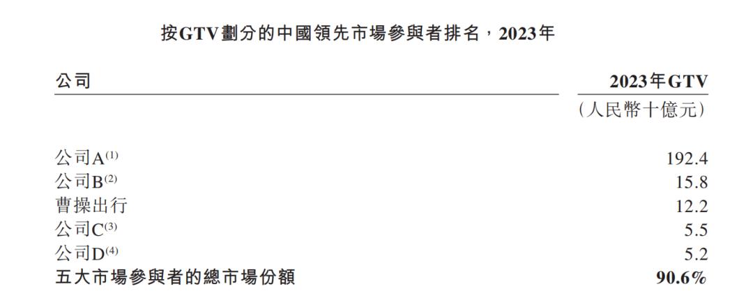 2021年-2023年,曹操出行一直位列行业前三,2023年其GTV为122亿元,市场份额约为4.79%。