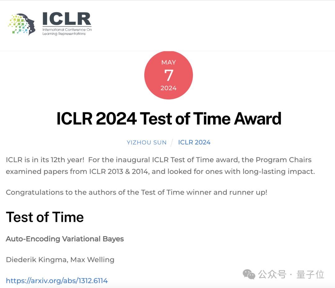 首届ICLR时间检验奖,颁向变分自编码器VAE。