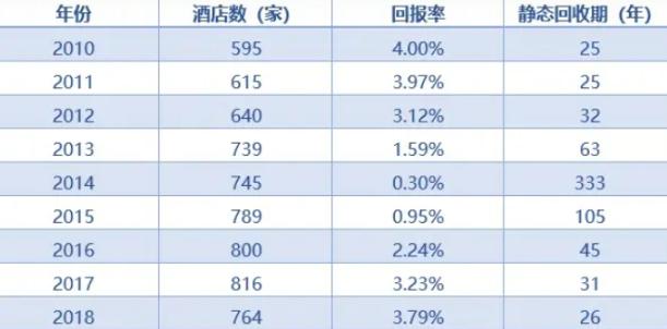 其二,县城旅游火热之下,极其考验县城的游客接待能力。一方面,国家旅游局相关数据显示,2010年至2018年期间,国内五星酒店回报率最高的是2010年,静态回收周期长达25年。最低的为2014年的0.3%,需要333年才能回本。