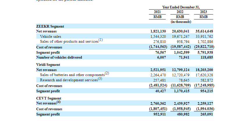 极氪在招股书中,也将业务分为ZEEKR部分、威睿部分、和CEVT部分。后两部分业务在极氪车辆交付规模尚小之时,对公司财务收入起到了重要的作用。