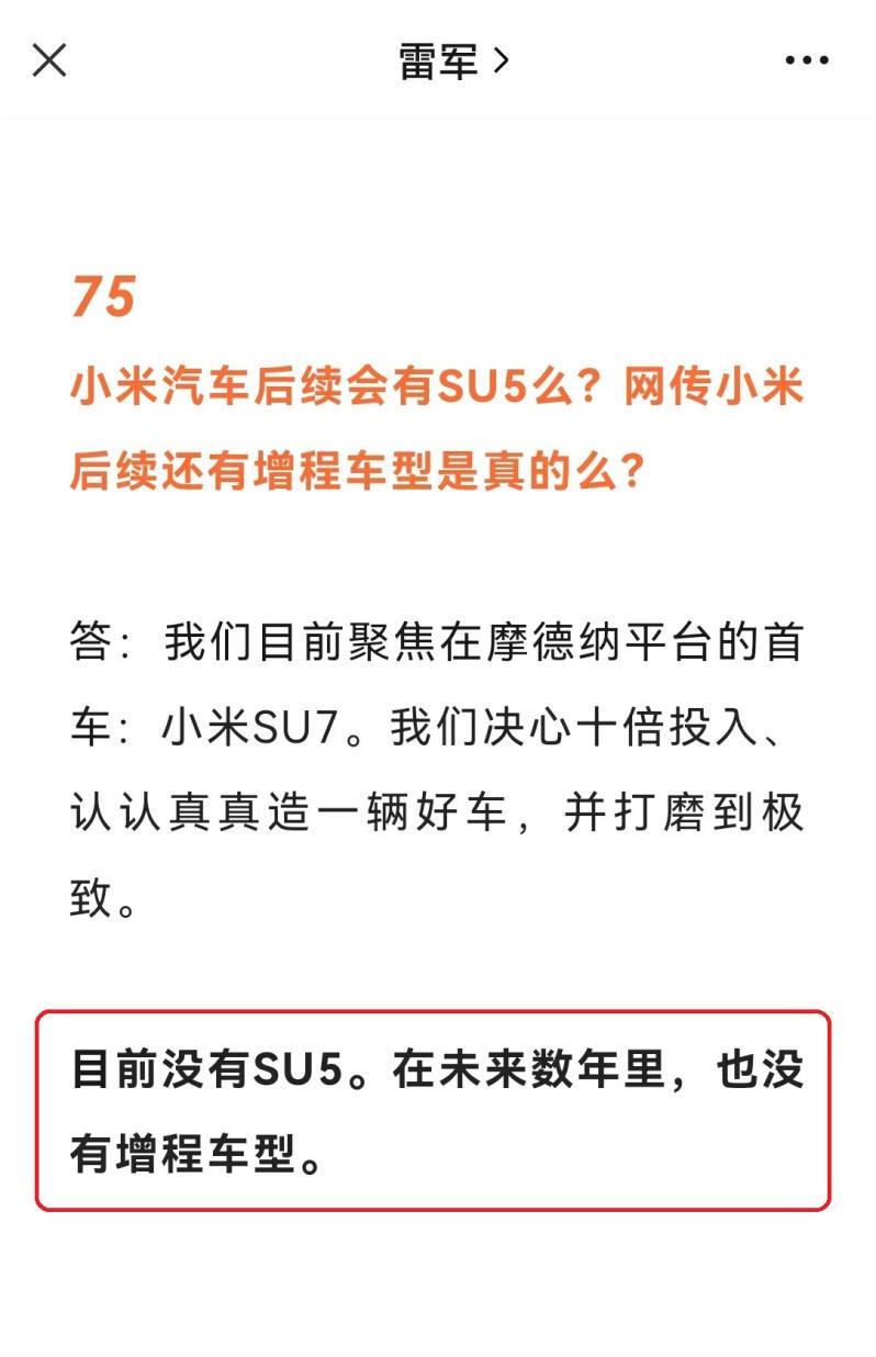2024 年 1 月 10 日,小米汽车发布了《小米汽车答网友100问(完结篇)》里,官方 Q&A 中的第七十五个问题里回答了“目前没有 SU5。在未来数年里,也没有增程车型”。