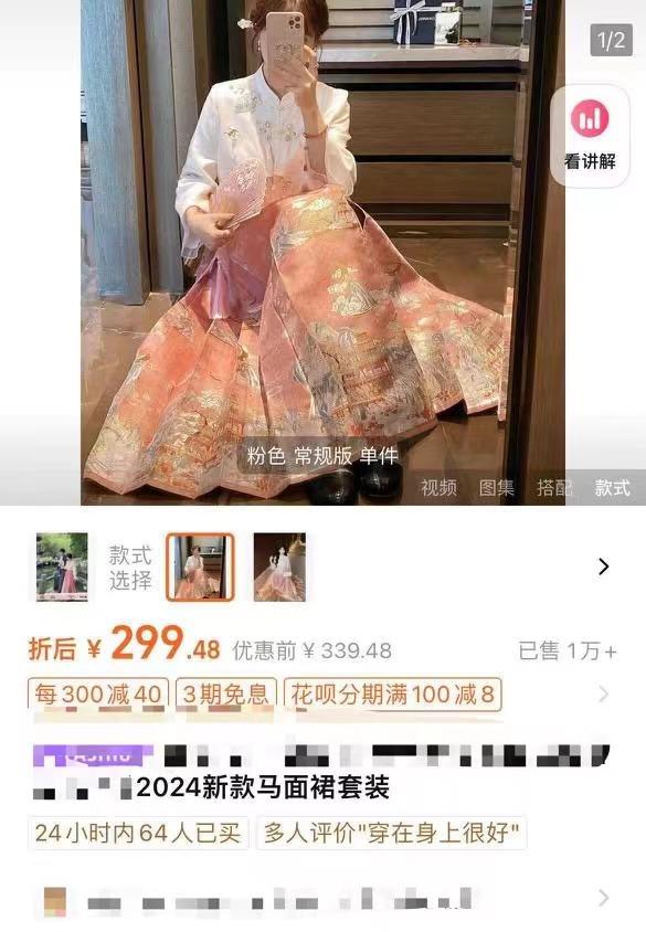 而这款马面裙单品在马面裙品类过去一年的爆火中,也成功打爆,淘宝上的累计销售已经超过1万件。在短视频平台的素材传播和投流,是其热卖的一大助力。