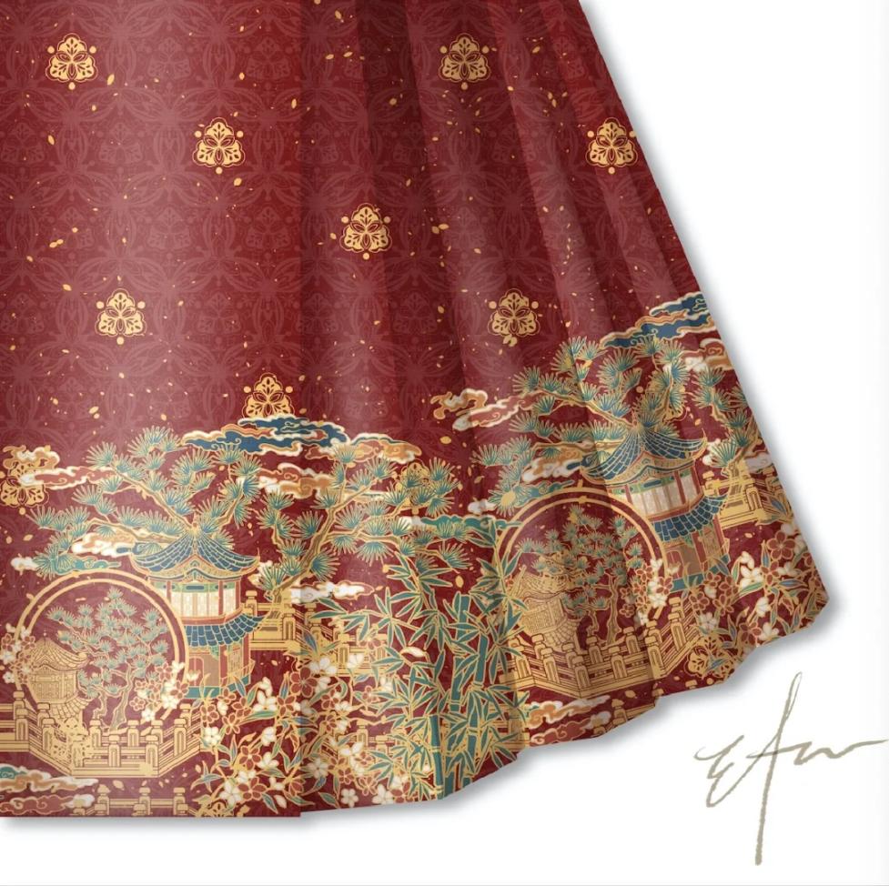 一凡有自己的设计审美偏好,相较于别的画手,喜欢把花纹放得更满。汉服圈有一句话,“没有一个女孩能够逃过大明”,一凡非常认同。她深入研究过南京云锦博物馆的馆藏,尤其青睐明制汉服,“比如万历皇帝和皇后王喜姐的那几件礼服,都是非常富丽堂皇的。”一凡受这些影响,也偏向于喜欢富丽堂皇的风格,“我的马面裙不仅喜欢加金丝,还会加彩金丝进,让裙子远远一看就流光溢彩。”