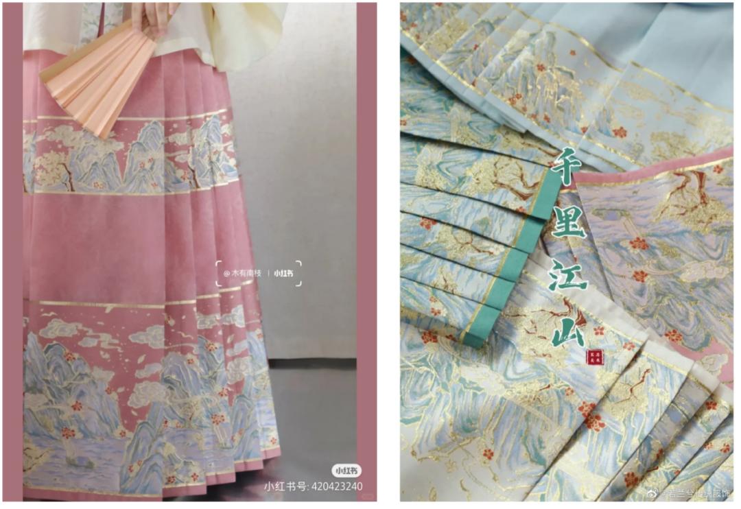 除了按照生肖和年节去走的固定趋势(比如年关会约生肖图案,中秋多是关于月亮、兔子或桂花的花纹),一些潜在爆款趋势,设计师们能够在一两个月之前就观测到。比如,一凡就观察到,之前一段时间约旋裙(宋制,外观像没有褶的马面裙)的变多了,不过最近风头似乎又过了。