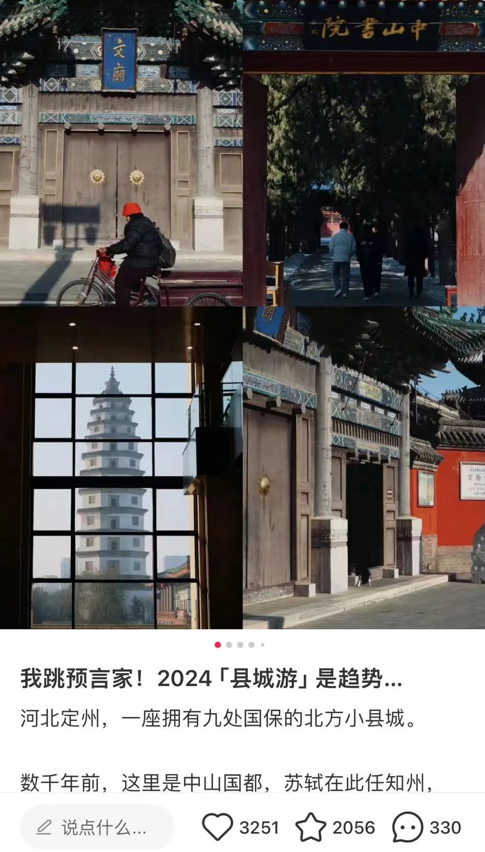 “我跳预言家,2024县城游将成为趋势......”这是小红书一篇高赞笔记的内容。在这篇笔记中,一博主分享了自己的家乡——河北定州,不仅有2600年的建城史和无数的古迹,还曾留有北宋诗人苏轼的“痕迹”。“羊十七”表示以前定州对自己来说,只是逃离大城市的“避风港”,每次都是利用节假日来躺平,从没好好看看家乡的样子。