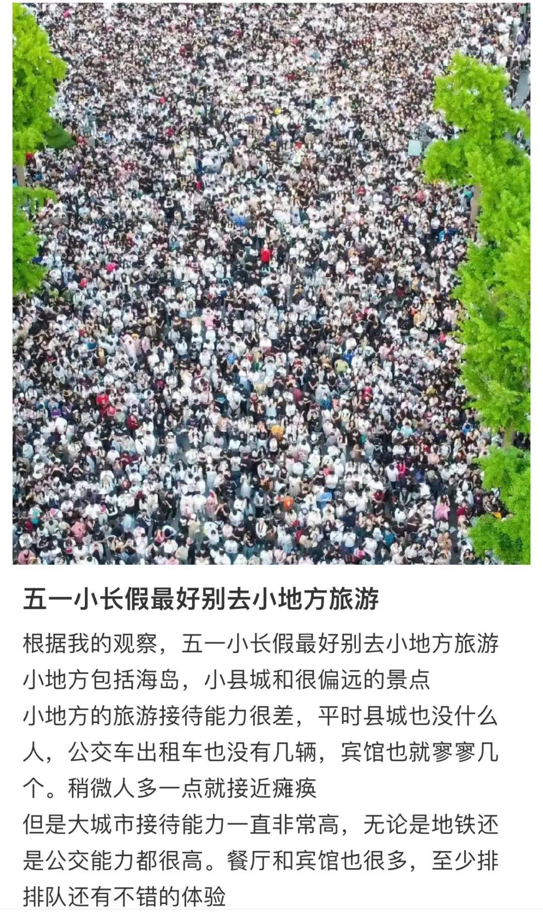 有网友在社交平台上分享了自己的经历:去县城旅游遇到下雨天气,当天打车排到200多号。还有网友表示:“县城的人也很多,哪有什么岁月静好,全靠滤镜加得好”。甚至有一些网友已经开始“规劝”大家不要盲目跟风。有网友表示:据自己的观察,假期最好别去小地方旅游,比如海岛、小县城以及偏远的景点。因为小地方接待旅游的能力比较差,稍微人多就会“交通瘫痪”。