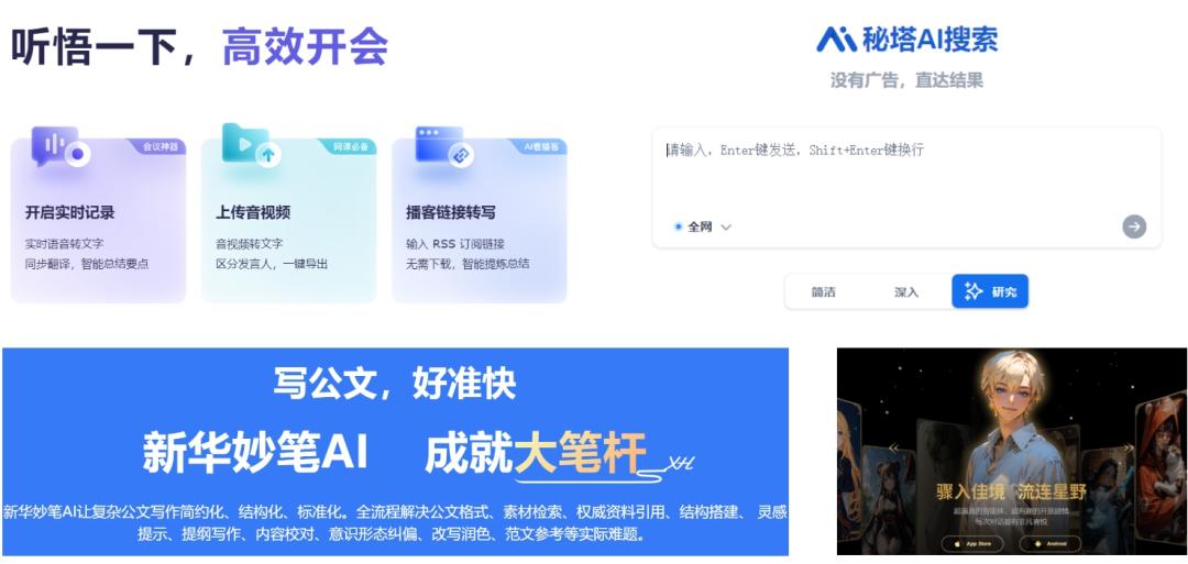当然,这个单点,还可以指某个具体场景,用你的大模型,独一无二,效果巨好。比如生成高清质感图像的Midjourney,开源且能定制各种插件的Stable Diffusion。国内产品比较靠近这个维度的,像是读音频的通义听悟、搜索场景的秘塔、公文写作的新华妙笔、陪伴社交的MiniMax(星野)等等。