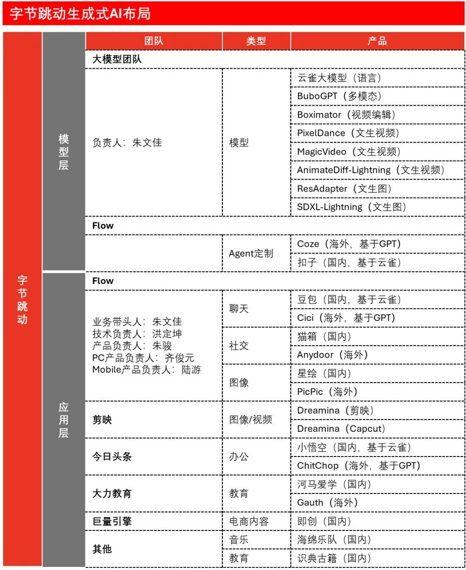 沿着这个思路,抖音是不是可以在用户发表评论、创作视频、检索信息、管理个人资料这些场景嵌入AI,让信息的创作和理解效率更高呢?刚巧前两天还看到一篇文章,整理了字节的AI产品布局: