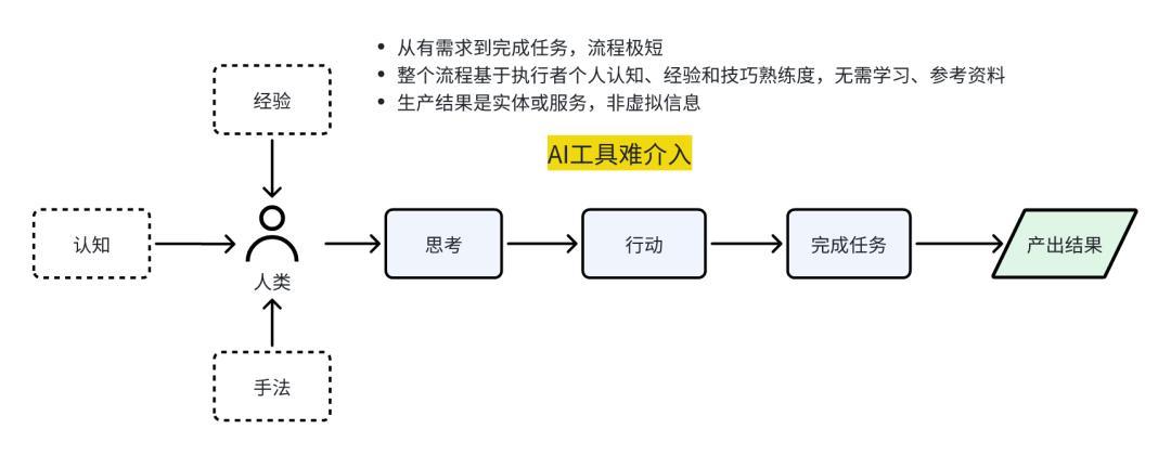 凡是不需要信息吸收和传递,只基于想法来完成的生产动作,不太适合和大语言模型结合。如下图: