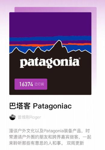 而在文化输出上,Patagonia在国内做了一档播客节目《巴塔客Patagoniac》,将户外、环保、创业等话题糅杂在深度的对谈内容中,体现出品牌的调性。要长期做这样一档硬核的播客节目,其投入并不小。