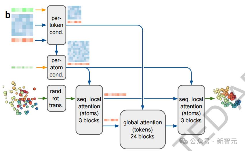 扩散模块(Diffusion Module)直接处理原始原子坐标和一种粗略的抽象Token表征,而不采用旋转框架或任何等变处理。
