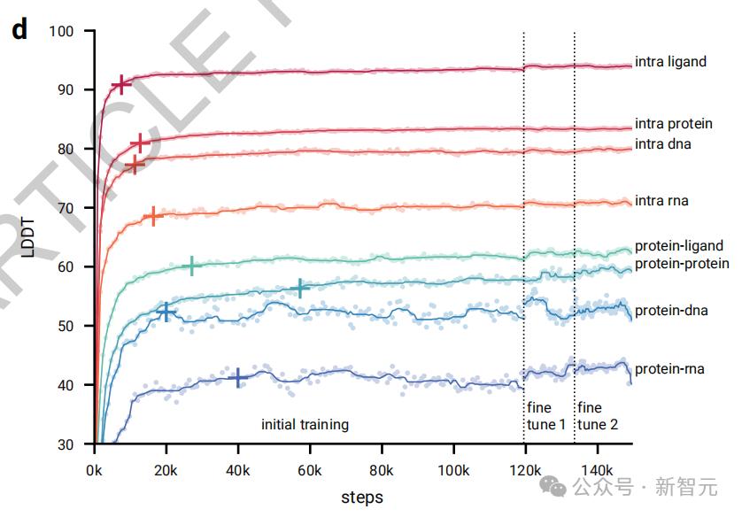 如图2d所示,在初始训练阶段,模型很快就能预测出局部结构(所有内链指标迅速提升,在前20,000次训练步骤中就达到了最大性能的97%)。
