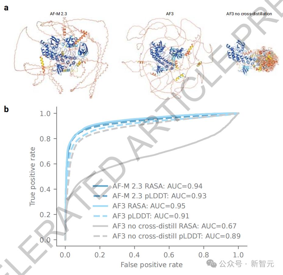 通过在预训练数据集中加入AlphaFold-Multimer v2.3预测的结构,使AlphaFold 3学会了模仿「用长的扩展环路来表示无结构区域」这种行为,进而极大地减少了AF3的幻觉行为。