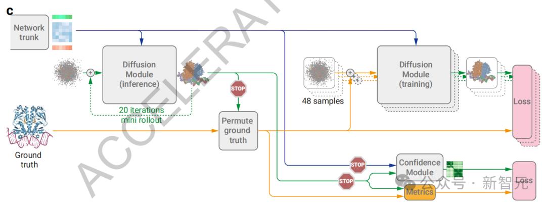 最终,成对和单一表征连同输入表示一起传递到新的扩散模块(图2b),该模块取代了AlphaFold 2的结构块。