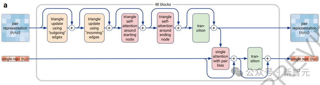 新的「Pairformer」(图2a)取代了AlphaFold 2的「Evoformer」,成为主要的处理模块——只处理成对和单一表征,不再保留MSA表征,所有信息都通过成对表征进行传递。