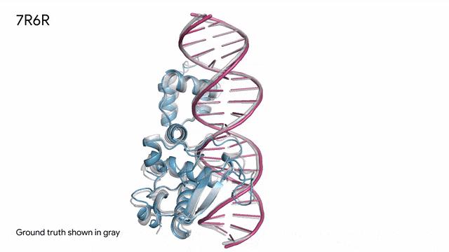 7R6R - DNA结合蛋白:AlphaFold 3对一个分子复合体的预测展现了蛋白质(蓝色)与DNA双螺旋(粉色)的结合,其预测结果与通过繁复实验得到的真实分子结构(灰色)高度吻合
