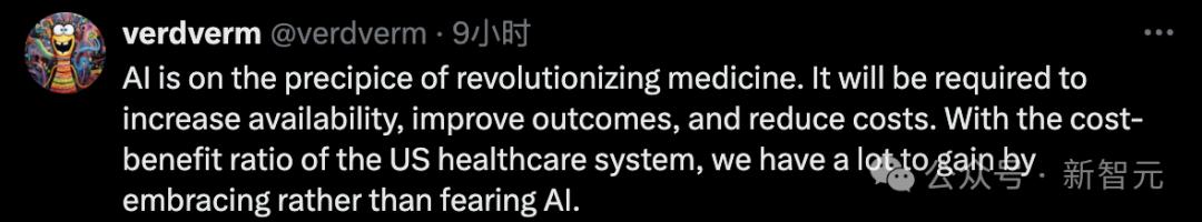 还有网友表示,AI即将彻底改变医学。我们需要用它来提高可用性、改善疗效,降低看病成本。