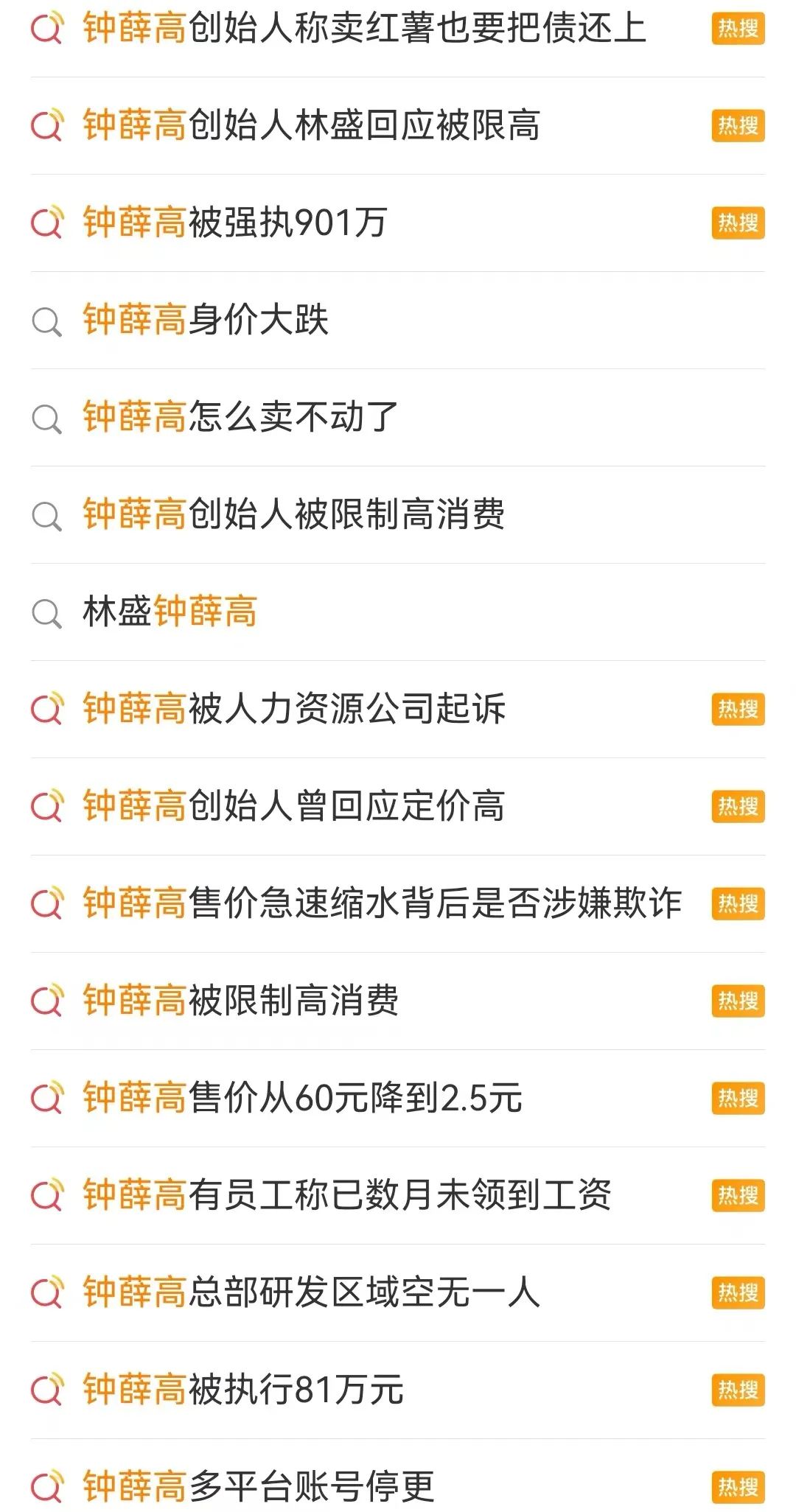 “钟薛高被执行901万”、“钟薛高称有员工数月未领到工资”、“钟薛高创始人称卖红薯也要把债还上”,这些词条轮番被顶上微博热搜,而在词条之下,是投资方撤资、资金链断裂、近乎走向末路的钟薛高。