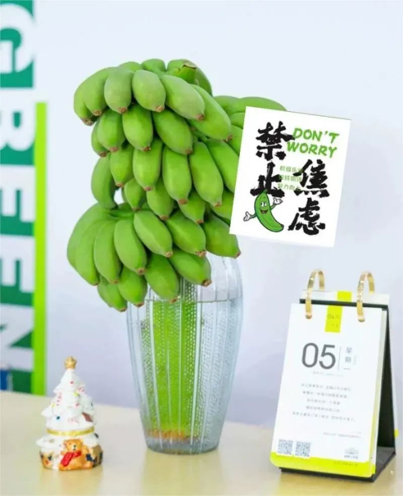 聪明的商家还将苹果蕉与打工人的“焦虑”联系在一起——插上一串“蕉绿”成为当代年轻人办公桌上的新景观。有00后说,“养着养着从绿变黄,意味着‘焦虑化散’”,话里颇有些玄学意味。