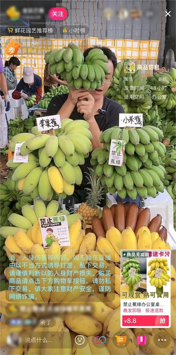 《天下网商》发现,无论在淘系还是在拼多多、抖音,可以水培的“蕉绿”都是新晋人气王:抖音上,“水培香蕉”的话题有超过1.3万人参与,相关视频有累计1.2亿次播放,很多主播直接在田间地头插上手机直播,背后是绿油油的香蕉和农户忙碌的打包发货的场景。