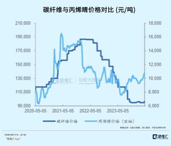 从22年下半年开始出现快速累库现象,同时伴随着价格下降,目前各种规格的国产碳纤维均价在96.25元/千克,较22年高点下滑了几乎整整一半。