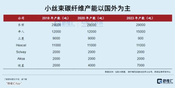 在小丝束上,国外东丽、帝人、Hexcel的产能领先,国内公司产能以中复神鹰和光威复材为主,与国外有一定差距,但产品范围、性能方面已经逐渐靠拢,高端产品质量和规模与下游应用的适配上仍待进步。