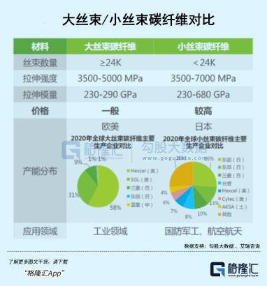 碳纤维可以按照丝束纤维数量划分,24K以下称为小丝束,24K以上称为大丝束。小丝束的力学性能更加出色,但制备成本也非常高,多用于航天军工领域;而大丝束胜在以规模分摊成本,多用于风电、机电、交通运输等工业领域。