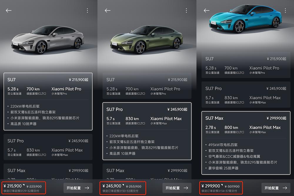 如果现在下单小米SU7 Pro,交付周期为30-33周,最快也有望在年底前提车。若下单小米SU7 Max版本,交付周期为34-37周,最早也需要到明年初才能提车了。