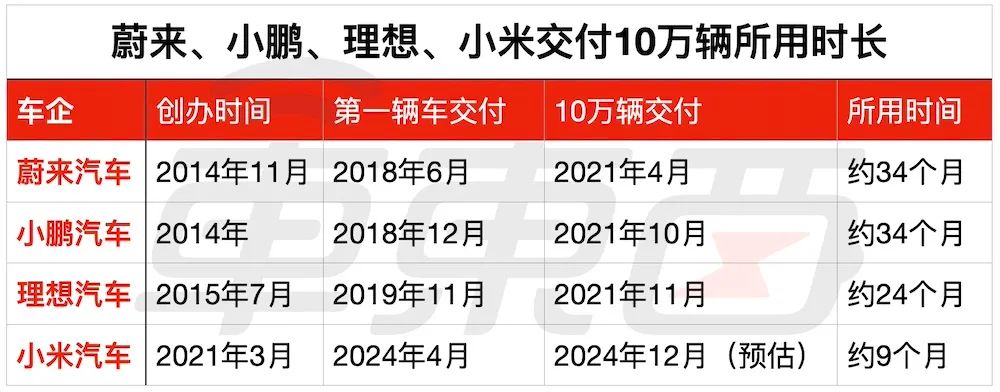 蔚来汽车从第一辆车开始交付到完成10万辆交付用了34个月,小鹏从第一辆车开始交付到交付10万辆用了34个月,理想的交付速度最快,也用了24个月。