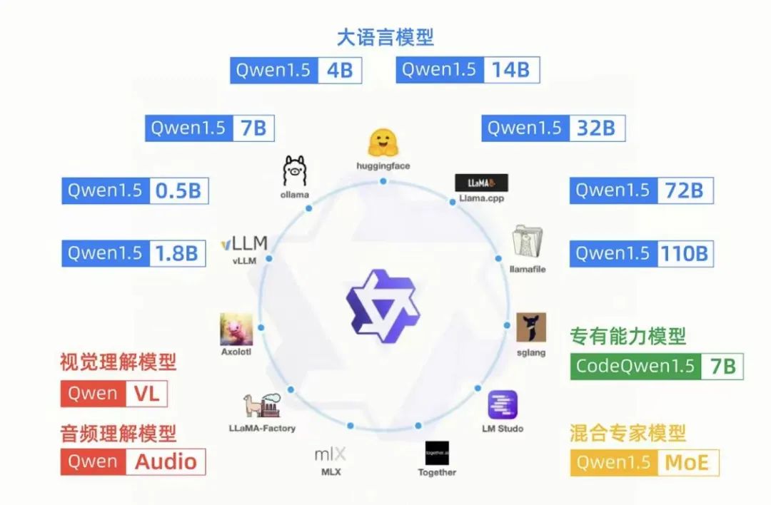 通义已经开源了参数规模从5亿到1100亿的8款大语言模型。其中,小尺寸模型如0.5B、1.8B、4B、7B、14B,针对手机、PC等端侧设备;大尺寸模型如72B、110B能,目标是企业级和科研级应用;中等尺寸如32B,期望在性能、效率和内存占用之间找到最具性价比的平衡点。此外,通义还开源了视觉、音频、代码、混合专家模型。周靖人强调要高质量地开源,通义72B、110B开源模型,都曾登顶开源榜单Open LLM Leaderboard榜首。