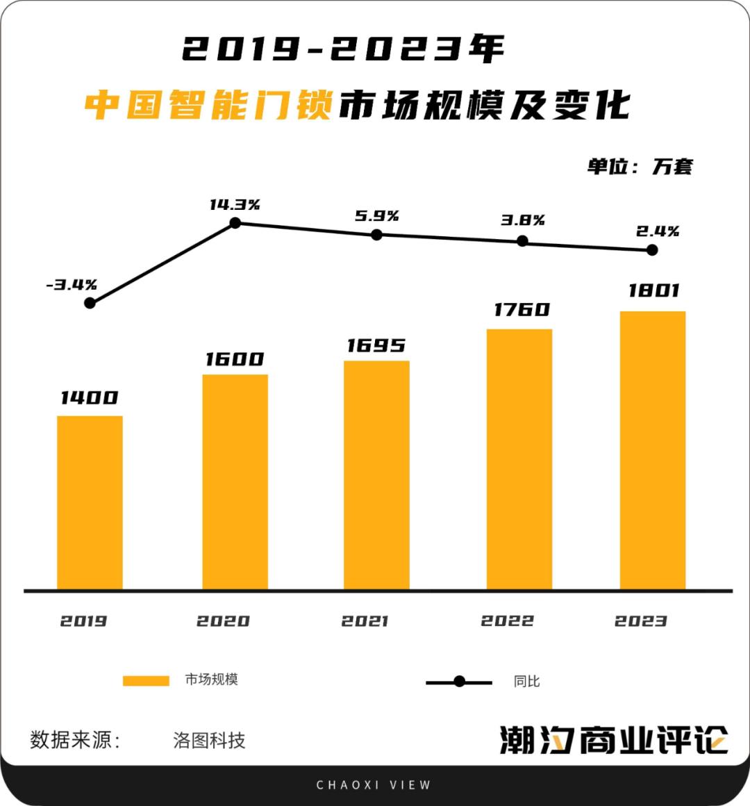 据洛图科技数据显示,2023年中国智能门锁的全渠道销量,同比2022年仅增长2.4%。整体来看,自2020年以来,中国智能门锁市场规模增长同比呈下滑趋势。当然,这也与房地产产业持续低迷,导致对下游产业需求减少有关系。