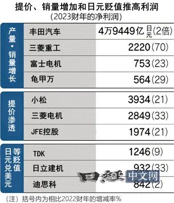 2023财年日元兑美元贬值约10日元。大和证券的数据显示,日元兑美元汇率贬值1日元,对主要企业的经常利润具有约0.4%的推高作用。