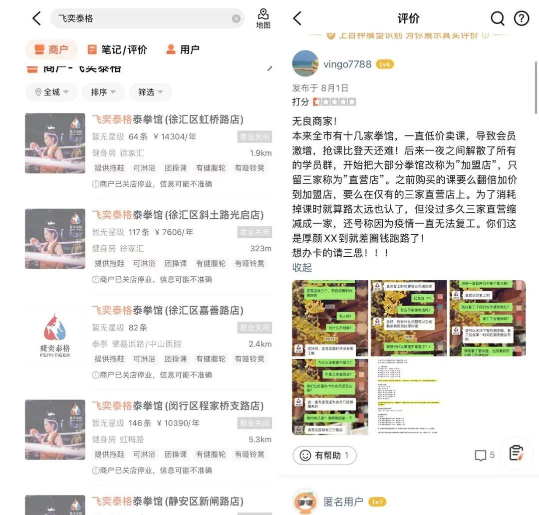 例如,上海规模最大的泰拳馆“飞奕泰格”,曾一度开出13家门店,2021年的总学员数近2万名,拥有60名泰国裔教练。但2023年底,飞奕泰格宣布,将现有门店缩减为6家直营店和3家加盟店。如今,在大众点评上搜索飞奕泰格,早已往事如烟—— 一家店都不剩了。