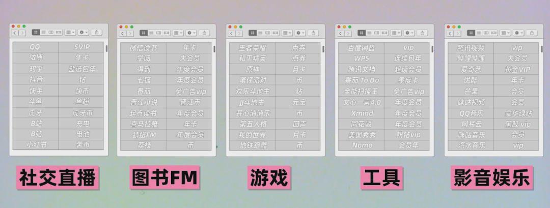 分别是社交直播、影音、图书 FM 、工具和游戏,每一大类选了比较有代表性的 10 项服务。