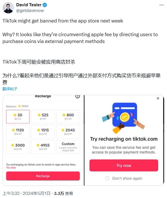 就在刚刚过去的 5 月 1 号,有消息传出,抖音的海外版 Tik Tok 已经开始小范围测试,在 App 内引导用户通过 Tik Tok 官网来购买用于直播打赏的金币,多出来的金币也是苹果税部分。